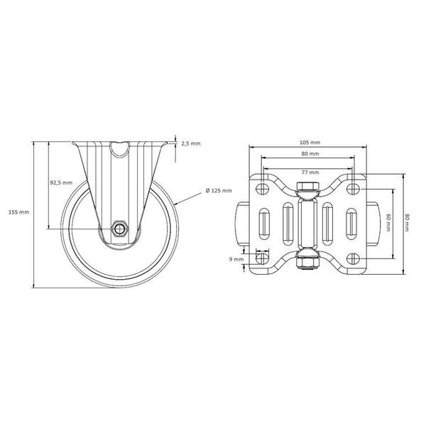 Die Bockrolle kann im Temperaturbereich -16 °C bis + 80 °C verwendet werden. Das Lochmuster hat Abmessungen von 80x60mm und ist für Schrauben mit Löchern von 9 mm Durchmesser versehen.
