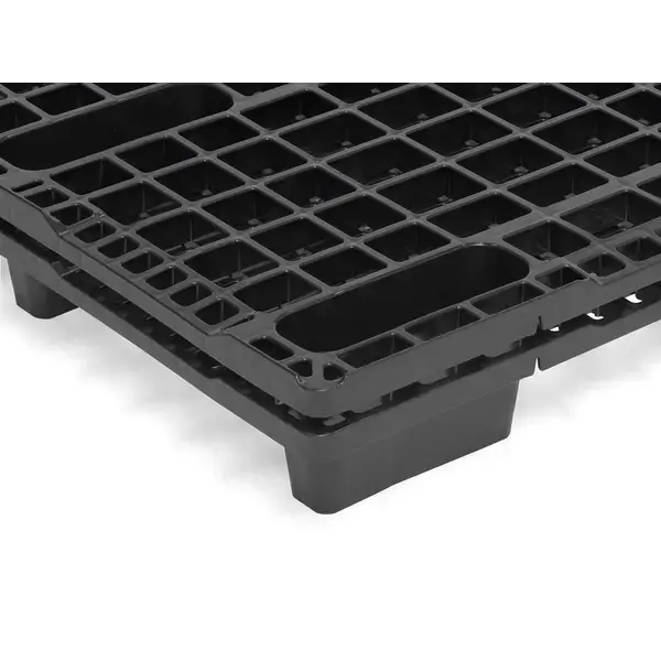 Diese Kunststoffpalette besteht aus recyceltem HDPE-PP-Mischkunststoff und ist daher auch für feuchte Umgebungen geeignet. Da die Palette aus Kunststoff gefertigt ist, erleichtert dies die gründliche Reinigung und das schnelle Trocknen. Der Temperaturbereich dieses Kunststoffs liegt zwischen -40°C und +70°C.